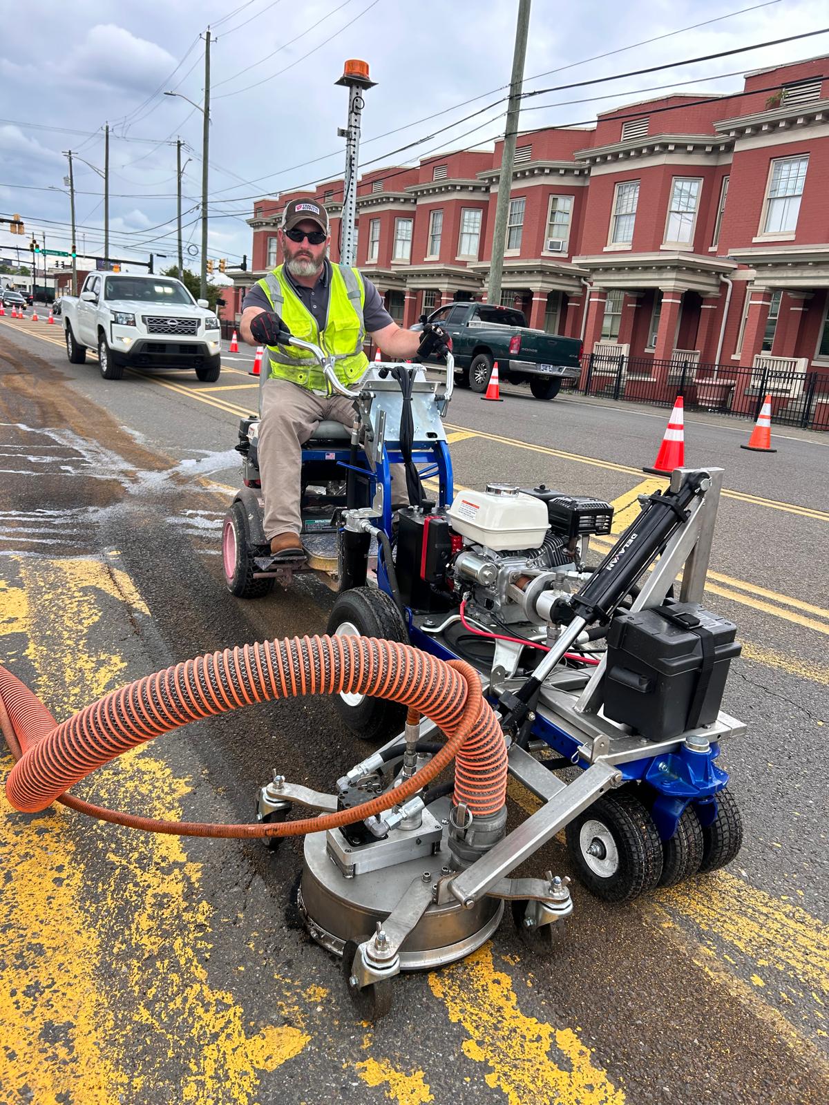 Within days, we mobilized. The city rented our StripeX 7000T trailer-mounted UHP waterblasting system along with the Stripe Blaster Cart HR, our ride-behind precision removal tool. An APEX Product Specialist, Joe Pollard, arrived on site early Monday morning, and the team got right to work.